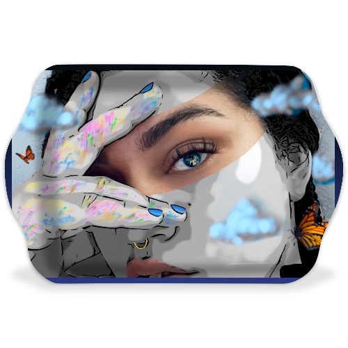 Start designing your rolling tray today. With endless customization options, no minimum order restrictions, and wholesale pricing for large quantities, you have everything you need to create a custom rolling tray that’s uniquely yours. *Note: Due to the tray customization process and curvature of the tray, any design elements placed on the curved/raised edges of the tray may be stretched, cut off, or not aligned exactly as seen in the design mockup/preview. As such, please do NOT place any important design elements like logos and text on the curved, raised, or tray handle areas. Place those design elements in the center of the tray. For best results, you can cover the whole tray, handles, curves and all raised areas with background colors or graphics that are more OK for stretch / crop while keeping text or logos more centered.