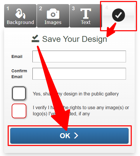 Click Step 4 and save your design. You can choose to keep it private or public. Once your design saves, you will receive an email to confirm it and it will be added to your shopping cart where you can purchase it.